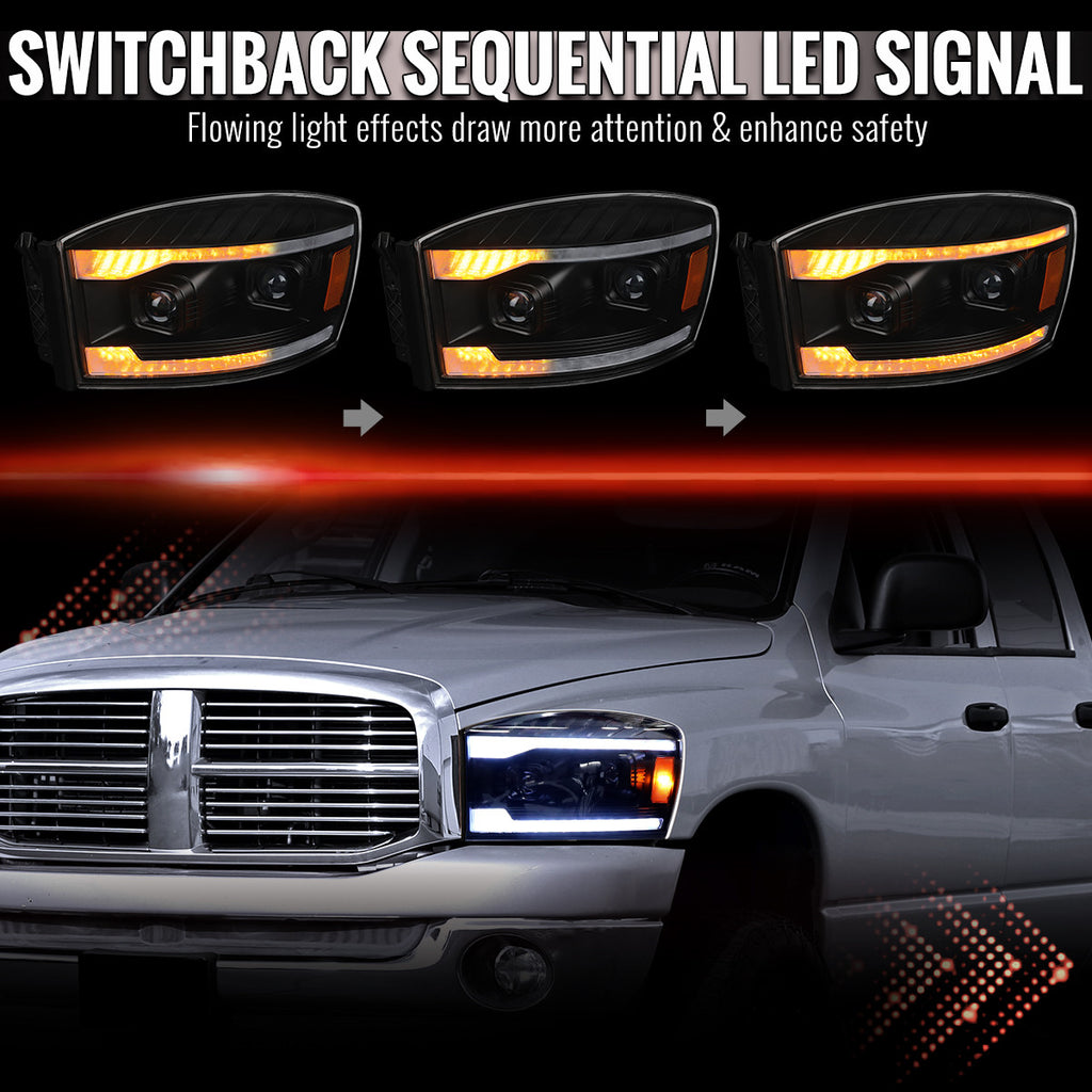 - Comes with (1) set of driver and passenger side LED strips projector headlights in black housing with clear lens